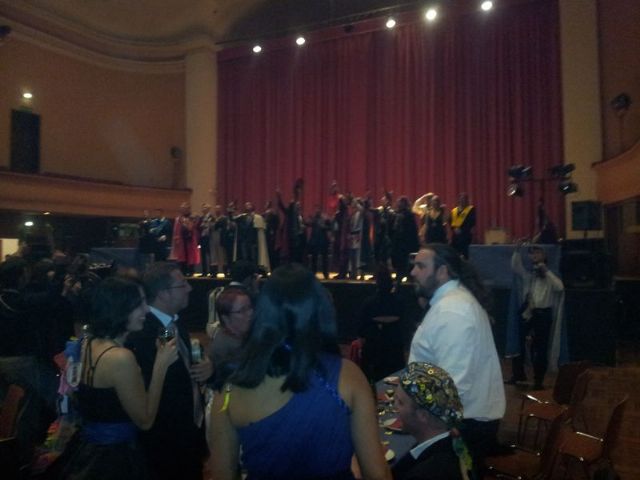 Un representante de cada grupo, y todos cantando el himno del banquete.