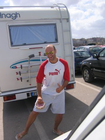 Como no salía ningún ferry para Córcega en varios días y ya no nos quedaban días de viaje, decidimos coger el ferry a Génova. Mientras súbiamos, Tamagochi, practicando el baile de pandereta.