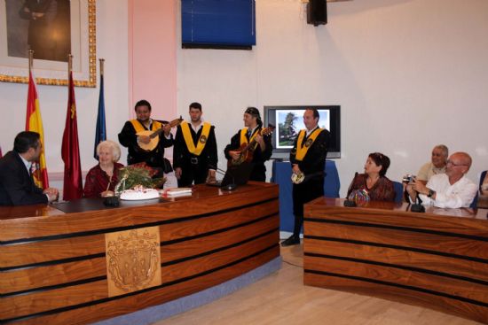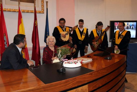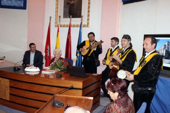 El pasado martes, un grupo de cuatro miembros de la Tuna de Medicina de Murcia, participamos en el homenaje a Dona Carmen del Cerro Ortiz, en su vuelta a su ciudad natal, Alcantarilla, tras estar fuera 87 anos. Fue en el Ayuntamiento de dicha ciudad, donde se le rindió homenaje, por su 94 cumpleanos, en su vuelta de Francia donde se tuvo que ir cuando tenías 7 anos. Para mi fue un placer entrar, junto con la tarta, cantándole el "cumpleanos feliz", para luego hacer un par de canciones más y terminar con nuestro tan murciano, "Bolero a Murcia". Nuestro pequeno homenaje fue regalarle el disco de la Tuna de Medicina de Murcia "Sabor a Murcia", con temas compuestos en su mayoría por nosotros, como el famosísimo "Paparajotes", "Haz Migas", "Rock del Zarangollo" o "Perfume de sol" entre otras. Billy, Tuna de Medicina de Murcia