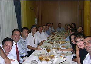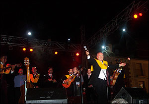 Posteriormente estuvimos con ellos en la actuación donde nos invitaron a subir al escenario a cantar juntos ante un público entregado a la magia del bolero y al carisma y simpatía de Rafael Basurto que hacía gala de su condición de Tuno Mayor honorífico de nuestra tuna. Desde ese momento hasta el final de la actuación todos los integrantes de “Los Panchos” actuaron con la beca de la Tuna de Medicina en el pecho haciendo publicidad y gala de lo que honoríficamente son... tunos de la Tuna de Medicina de Murcia.