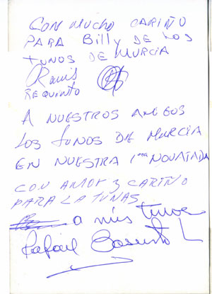 Al terminar la actuación ya en camerinos pudimos compartir unos momentos más donde quedó como recuerdo de tal inolvidable velada las firmas dedicadas por Rafael Basurto y sus compañeros y que se muestran a continuación.