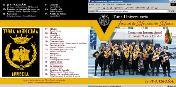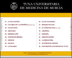 La Tuna Universitaria de la Facultad de Medicina de Murcia ha grabado un nuevo disco que salió al mercado a finales de Junio, con diez canciones nuevas muy conocidas como ¡Y Viva España!, Clavelitos, Adelita, Cielito Lindo ... y recordando ocho canciones de su discografía anterior como Suspiros de España, Murcia ... Es decir, un total de dieciocho canciones de las más típicas de Tuna ...