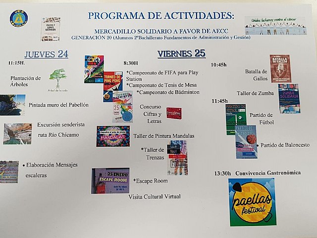 "También pondremos a la venta productos como, pulseras conmemorativas del aniversario del centro, gofres, crepes, libros de segunda mano, tazas, camisetas, etc. Cuyos beneficios serán destinados a la AECC de Murcia", destacan.