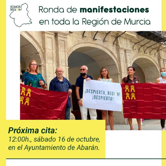 Tras la presentación el pasado jueves 28 de septiembre de la campaña ¡Despierta Región, Despierta!, el partido regionalista Somos Región ha iniciado una serie de concentraciones / manifestaciones frente a los ayuntamientos de todos los municipios de la Región, concretamente el pasado sábado 2 de octubre se realizó la primera de ellas en el municipio de Abanilla.