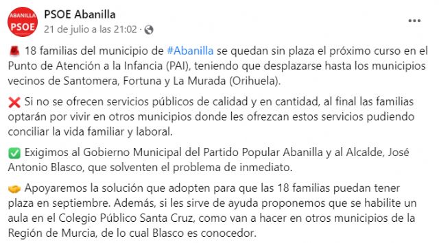 Lo que en los últimos años era un problema puntual, ahora se ha acrecentado porque el número de familias afectadas es mucho mayor, convirtiéndose en un problema estructural. Es evidente que la oferta de plazas actualmente es insuficiente y tiene que ser ampliada en los próximos años. El pasado jueves el PSOE Abanilla denunció en redes sociales esta situación, donde manifestó que, si no se pone remedio, muchas más familias se verán obligadas a desplazarse durante el próximo curso hasta los municipios vecinos de Fortuna, Santomera o La Murada (Orihuela), como ya ocurre.