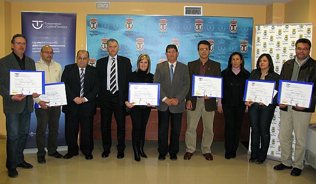 El director general de Promoción Turística, Ángel Campos, junto con el alcalde de Águilas, Juan Ramírez, entregó hoy los certificados de Compromiso de Calidad Turística a seis empresas de la localidad, tras haber superado favorablemente las evaluaciones requeridas por el Proyecto de Calidad en Destinos.