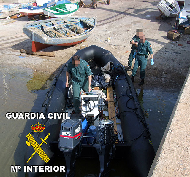 Seguidamente se coordina el dispositivo policial conjunto entre componentes de distintas Unidades de la Guardia Civil de Murcia y Vigilancia Aduanera, logrando interceptar en las proximidades de lugar del alijo la embarcación utilizada para la comisión del mismo, emprendiendo sus tripulantes la huída de los agentes.