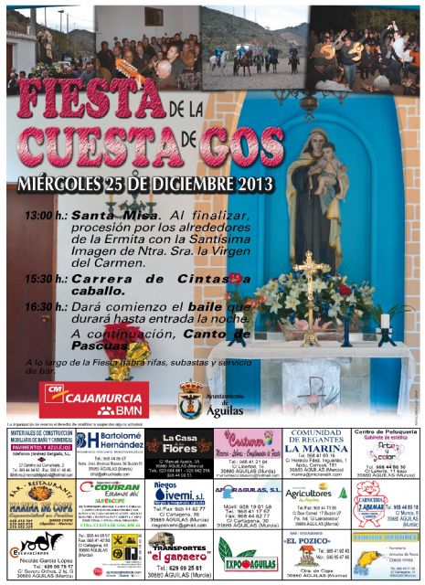 Celebración de la Festividad del Nacimiento en la Cuesta de Gos, con el siguiente programa de actos: a las 13 horas, Santa Misa en la ermita de esta pedanía y seguidamente procesión con la imagen de la Virgen del Carmen. A las 15:30 horas, carrera de cintas a caballo, y desde las 16:30 horas, bailes y cantos de pascuas. A lo largo de la fiesta habrá rifas, subastas y servicio de bar.