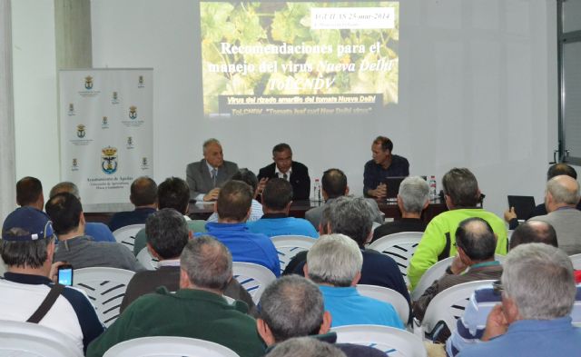 El alcalde de Águilas, Bartolomé Hernández Giménez, y el director general de Industria Agroalimentaria y Capacitación Agraria, Ángel García Lidón, han asistido a una charla informativa sobre recomendaciones para el manejo del virus Nueva Delhi, acompañados por el edil aguileño de Agricultura, Francisco Navarro Méndez.