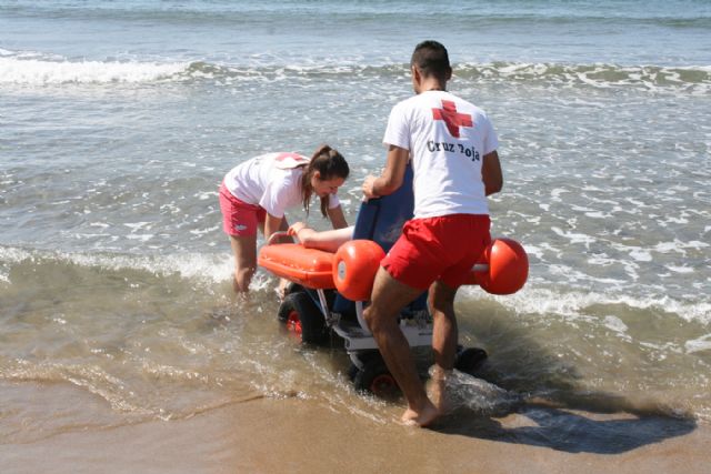 Acompañados de sus monitores y de los miembros de la Organización Humanitaria en Águilas, los usuarios de la asociación aprovecharon el magnífico clima que estos días existe en el municipio para darse un baño en la playa situada junto al albergue que les acoge, gracias a las sillas anfibias especialmente adaptadas para ellos.
