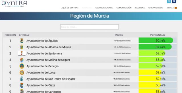 Águilas continúa siendo el municipio más transparente de la Región y el tercero de España, según el índice dinámico DAM (Dyntra Ayuntamientos y Municipios); un evaluador que sitúa al Ayuntamiento de la localidad entre los más transparentes de España, cumpliendo 147 de los 162 indicadores, con un 90,74% de cumplimiento.