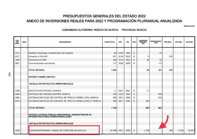 En el anexo de inversiones reales para 2022 y la programación plurianual anualizada se puede contemplar que "la inversión para las obras del Corredor Mediterráneo ramal de conexión de Águilas para el año 2022 es de cero euros", ha puntualizado Reverte.