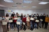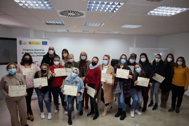 La alcaldesa de Águilas, Mari Carmen Moreno, y el técnico de Gestión Económico-Financiera del Ayuntamiento de Águilas, Diego Mª Martínez, hicieron entrega de los certificados de profesionalidad a los participantes que han superado con éxito la segunda edición del itinerario formativo de inserción "Servicios Auxiliares de Estética", incluido en el Programa Operativo de Empleo, Formación y Educación (POEFE) 'Águilas T-Forma'. El programa Águilas T-Forma, cuyo importe asciende a más de 600.000 euros, subvencionado por el Ministerio de Política Territorial y cofinanciado en un 80% por el Fondo Social Europeo (492.893,22 euros), siendo la aportación municipal de 138.394,90 euros.