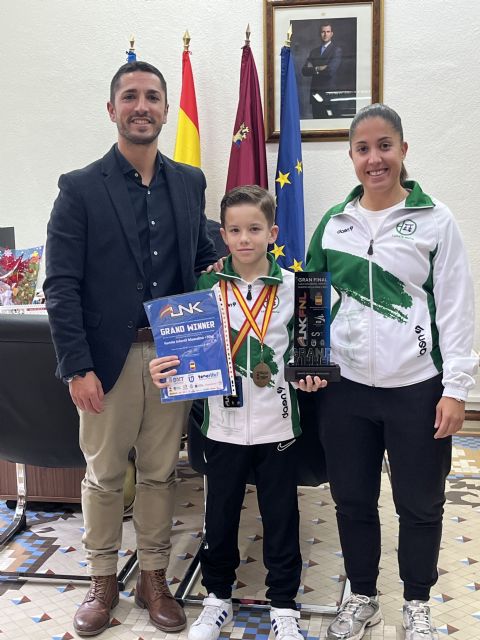 El karateka Jorge Piñero Gálvez es recibido en dependencias municipales por el alcalde de Águilas, Cristóbal Casado.