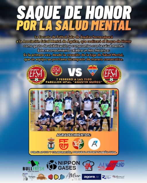 La Escuela de Fútbol Sala de Águilas homenajeará a la Asociación de Salud Mental de Águilas, que realizará el Saque de Honor como gesto de visibilización y compromiso con la salud mental.