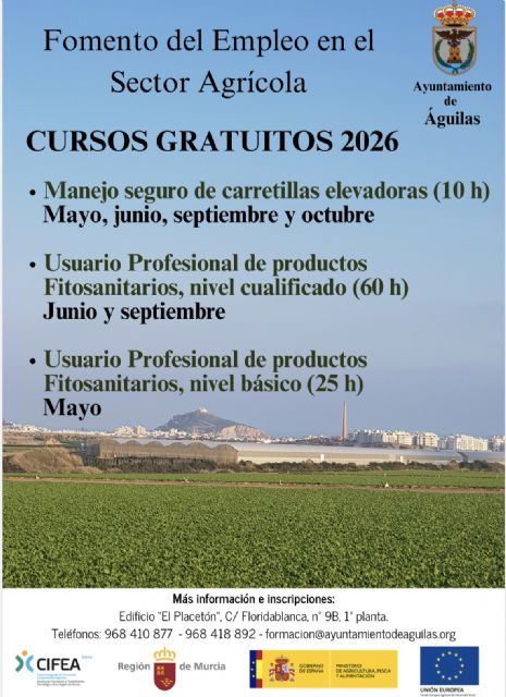 Conscientes de la importancia del sector agrícola en la localidad, el Ayuntamiento de Águilas, a través de las Concejalías de Agricultura y Desarrollo Económico y Formación y en colaboración con el Cifea, ha dado a conocer la nueva edición de cursos gratuitos para el fomento del empleo en el sector agrícola en la localidad que se desarrollarán durante el presente año.