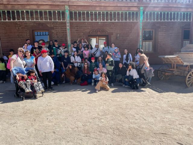 01/04/2026. Una veintena de familias y más de treinta niños, niñas y adolescentes viajaron ayer al parque temático del MiniHollywood, en Tabernas, Almería, en una actividad que culminaba el Programa para garantizar el derecho básico de alimentación, ocio y cultura de los menores durante las vacaciones escolares y la conciliación de la vida familiar y laboral.