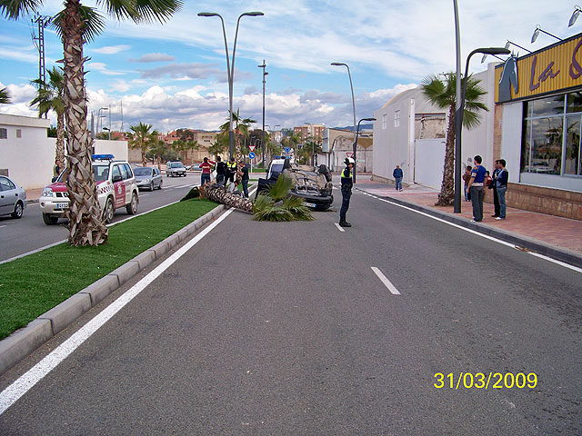 Agentes del Grupo de Atestados de la Policía Local de Alcantarilla han intervenido en la tarde de hoy en un grave accidente de circulación en el que han resultado heridos 3 ocupantes de un turismo al salirse de la vía por la que circulaba y quedar volcado con la ruedas hacia arriba en el carril contrario en la C/ Fernando III el Santo de esta localidad. Tras la llegada de los Agentes se ha comprobado cómo los ocupantes se encontraban con diversas heridas, por lo que han sido atendidos por un ambulancia del 061 que se ha hecho cargo de la atención médica. La causa del accidente ha podido ser un despiste de la conductora o un exceso de velocidad que no ha permitido a ésta el control del vehículo.