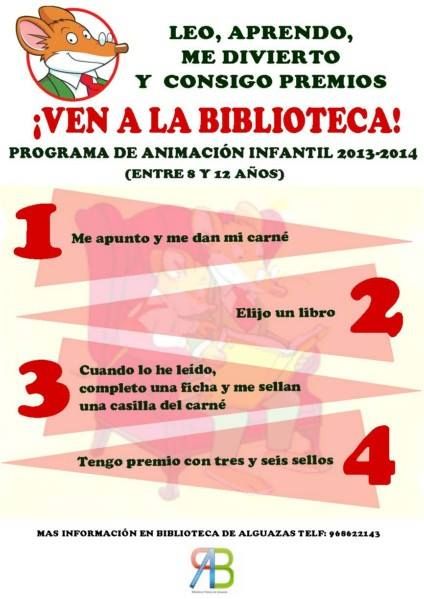 "Leo, aprendo, me divierto y consigo premios-¡Ven a la Biblioteca¡" es el lema de la nueva campaña de fomento de la lectura que ha puesto en marcha la Concejalía de Cultura del Ayuntamiento de Alguazas para este nuevo curso 2013-2014. Dirigido a niños de la localidad con edades comprendidas entre los 8 y los 12 años, este plan también busca promocionar entre los más pequeños el uso de las instalaciones y servicios que oferta la Biblioteca Pública Municipal a fin de que esta entidad se consolide como punto de encuentro para la ciudadanía en general y en un espacio vivo para la Cultura en la población.
