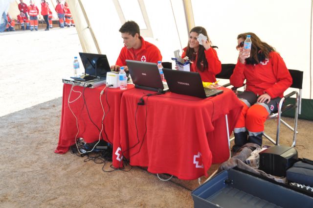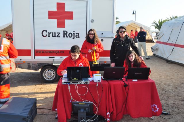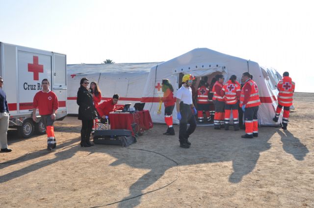 El ejercicio comenzo a las 9 de la mañana, con la llamada de un ciudadano al Centro de Corrdinación de la Región de Murcia 112, alertando de la llegada de una patera cargada de inmigrantes. Tras esta llamada, se trasladó al lugar una ambulancia de Cruz Roja, la cual constata la llegada masiva de inmigrantes a la costa, por lo que el Centro de Proximidad y Coordinación de Cruz Roja en la Región de Murcia decide activar el protocolo de actuación ante una gran emergencia. Conforme marca dicho protoloco, al lugar se desplaza una unidad móvil de coordinación, así como el equipo ERIE asistencia sanitaria, el equipo ERIE de albergue y el equipo ERIE de asistencia psicosocial, en el cual trabaja el equipo de filiación, compuesto exclusivamente por voluntarios de Cruz Roja Alhama (Andres, Jorge, Domingo, Raúl, Ana y Bea), encargado de la toma de datos de los afectado, algo súmamente importante cuando hablamos de grandes catástrofes. Para ello, se puso en marcha el sistema de filiación, operativo en sólo 10 minutos y permitió la filiación de unos 200 albergado en tan solo 60 minutos.