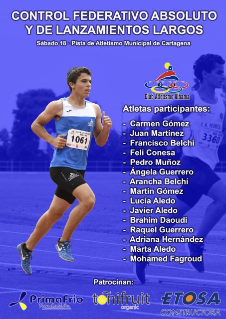 En la matinal del sábado, la 'Pista Municipal de Atletismo de Cartagena', será testigo del 'Control Federativo Absoluto y de Lanzamientos Largos', donde participarán los siguientes atletas de nuestro club: Carmen Gómez, Juan Martínez, Francisco Belchí, Feli Conesa, Pedro Muñoz, Ángela Guerrero, Arancha Belchí, Martín Gómez, Lucía Aledo, Javier Aledo, Brahim Daoudi, Raquel Guerrero, Adriana Hernández y Marta Aledo.