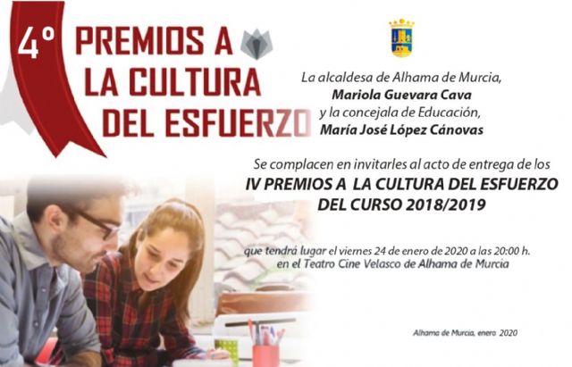 El Ayuntamiento de Alhama de Murcia, a través de la concejalía de Educación, organiza la IV edición de los Premios a la Cultura del Esfuerzo, que este año reconoce a un total de 21 alumnos/as del curso 2018-2019.