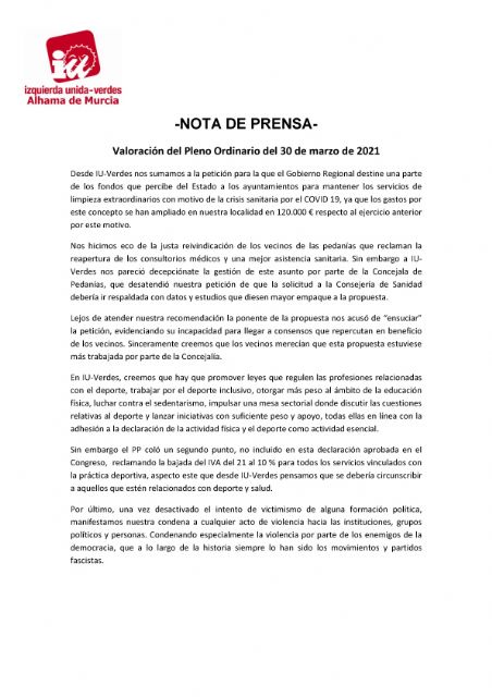 Desde IU-Verdes nos sumamos a la petición para la que el Gobierno Regional destine una parte de los fondos que percibe del Estado a los ayuntamientos para mantener los servicios de limpieza extraordinarios con motivo de la crisis sanitaria por el COVID 19, ya que los gastos por este concepto se han ampliado en nuestra localidad en 120.000 € respecto al ejercicio anterior por este motivo.