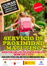 La concejalía de Educación informa de que hoy 6 de septiembre se abre el plazo de inscripción para el Servicio Municipal de Proximidad Matutino para el curso 2023-2024. Es gratuito y está dirigido a niños de los colegios públicos de Alhama de Murcia, desde infantil de 2 años a 6º de Primaria.