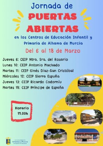 La concejalía de Educación del Ayuntamiento de Alhama ha anunciado las fechas para las jornadas de puertas abiertas en los diferentes centros educativos de Infantil y Primaria del municipio con motivo del inicio del plazo de matriculación para el próximo curso 2025/2026, que dará comienzo el jueves, 6 de marzo.