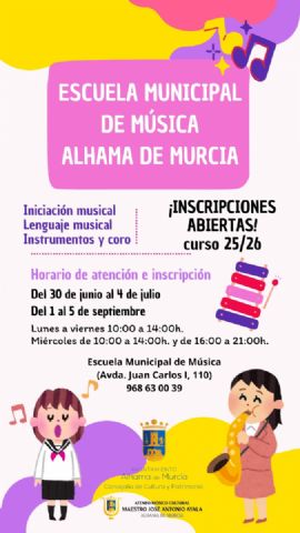 Para más información, las personas interesadas pueden acudir directamente a la Escuela Municipal de Música, o contactar telefónicamente a través del 968 63 00 39 (Escuela Municipal de Música) o del 968 63 00 00 (Ayuntamiento de Alhama de Murcia).