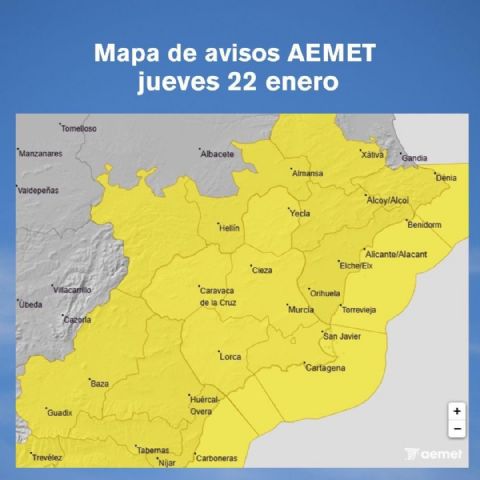 El Ayuntamiento de Alhama de Murcia informa de la activación de un aviso de nivel amarillo por fenómenos meteorológicos adversos relacionados con viento, emitido por la Agencia Estatal de Meteorología (AEMET), para la jornada del jueves 22 de enero.