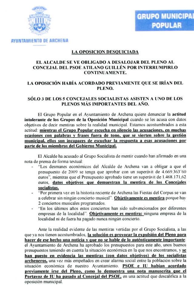 Murcia.com Región de Murcia Archena 18/05/2009 La oposición se desquicia, según el Grupo Municipal Popular Fuente: Grupo Municipal Popular, Ayuntamiento de Archena Comentar Nota remitida por PP: Archena
