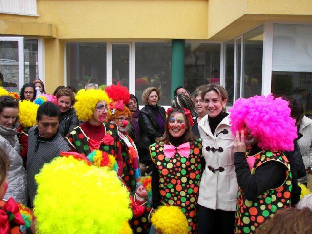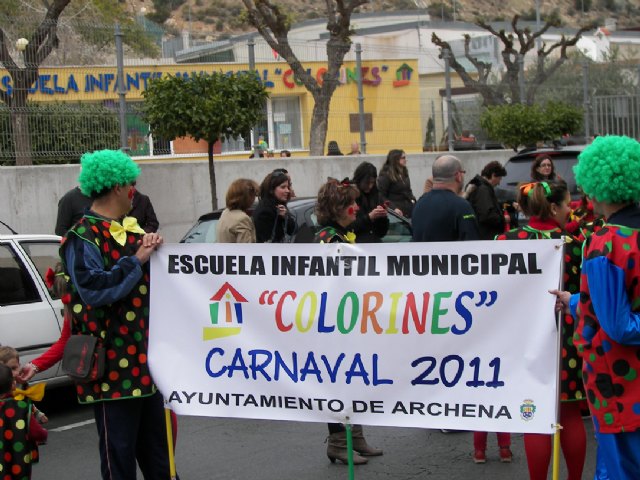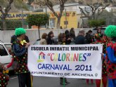 183 niños escolares de la Escuela Infantil Municipal ‘Colorines’ de Archena acompañados de sus padres y madres (más de 200 personas) y coordinados por sus tutoras y profesoras han desfilado esta mañana por la más de media docena de calles adyacentes a las dependencias de esta Escuela Infantil. Con música de carnaval en dos gigantescos coches móviles, todos los niños llevaban puestos trajes de payasos, con la diferencia de que cada clase poseía una peluca y nariz de diferente color. Igualmente, los tutores y profesorado en general desfilaron disfrazados de payasos de circo.