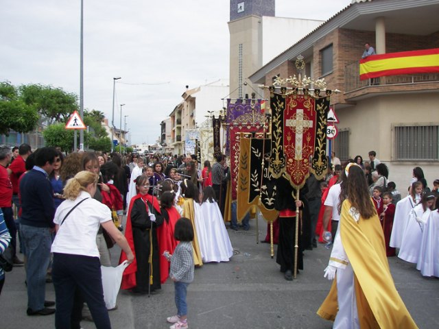 La banda de música de la OJE secunda al paso durante todo el camino hacia la Iglesia de San Juan Bautista, donde se recogerá este primer desfile infantil. Por delante, el párroco Alfonso Alburquerque seguido de las banderas de todas las cofradías en una fila, uno tras otro. Se mezclan todos los colores y todas las banderas. “La procesión está muy bonita y llamativa. Es lo que se necesita para que salgan adelante los nazarenos de Archena y sin rivalidad entre las cofradías, todos mezclados. Porque los niños no entienden de colores o de rivalidades”, explica Celia Garrido López, una de las representantes de la Cofradía Cristo del Gran Poder de los jóvenes.