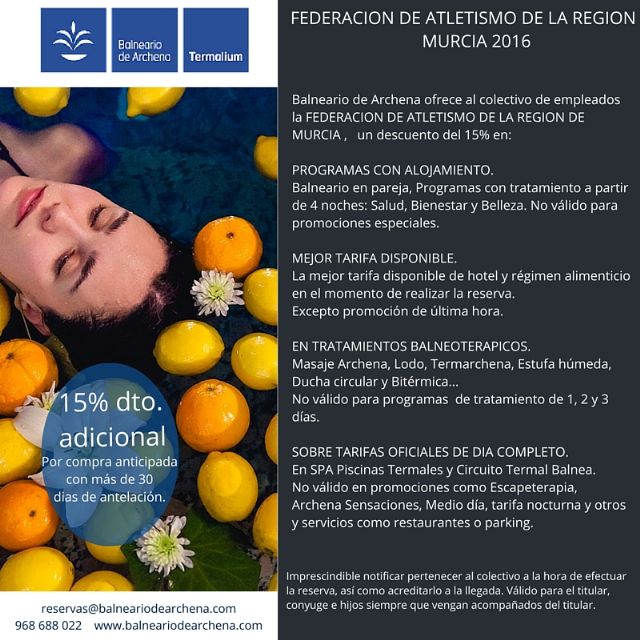 También en este 2016, pertenecer a la Federación de Atletismo de la Región de Murcia supondrá entre sus numerosas ventajas una serie de descuentos en los servicios que ofrece el Balneario de Archena. Y ello, merced a la renovación del acuerdo con los responsables del complejo termal ubicado en el Valle de Ricote.