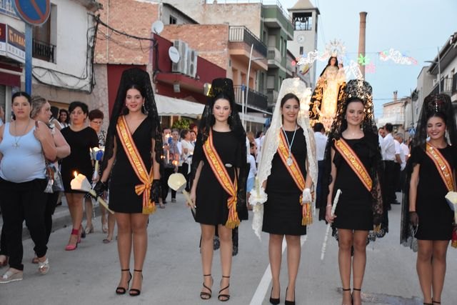 Varios cientos de personas acompañaron ayer noche en procesión a la Patrona de La Algaida, la Virgen del Rosario, en su recorrido habitual por las principales calles de la pedanía. Es uno de los actos más solemnes y tradicionales de las Fiestas Patronales que aún continúan durante la jornada de hoy y mañana martes, con más actividades festivas y populares como la carrera de cintas en bicicleta y la fiesta del azulete, así como las migas y la sardinada.