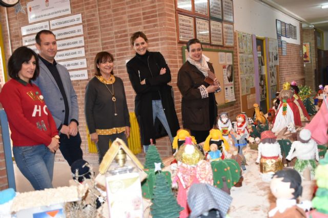 Patricia Fernández, Alcaldesa de Archena, y los concejales Mario Alcaraz, Mari Carmen Alcolea y Fulgencio García han visitado esta mañana el colegio Alcolea Lacal para ver en persona la obra magistral del belén artesanal que cada año realizan alumnos y docentes, en esta ocasión, efectuado con materiales de limpieza reciclables.