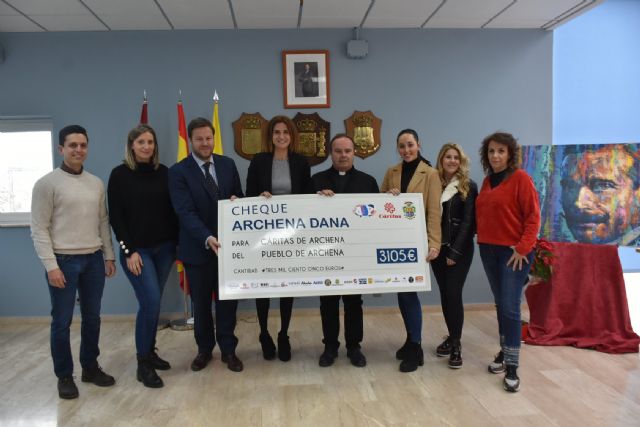 La Alcaldesa de Archena, Patricia Fernandez Lopez, junto al Concejal Mario Alcaraz Mármol, ha entregado esta mañana el cheque de 3.105 euros que se recaudaron en la fiesta benéfica que se celebró el pasado 26 de octubre a beneficio de los afectados en Archena por las lluvias intensas (fenómeno DANA), que cayeron durante 3 días en septiembre.