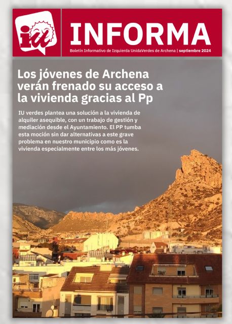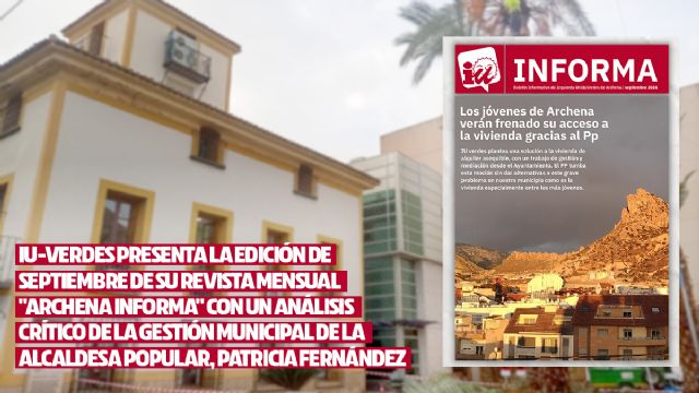 Como vienen realizando periódicamente, la asamblea municipal de Izquierda Unida-Verdes de Archena ha lanzado la edición de septiembre de su revista mensual, "Archena Informa", con el objetivo de ofrecer tanto en papel como en formato digital, una visión de izquierdas clara y crítica sobre los principales problemas del municipio y las propuestas de la formación local para abordarlos. En esta tirada, IU-Verdes hace un repaso por temas clave para la mayoría social como el acceso a la vivienda, la falta de actuación ante las inundaciones, la solidaridad internacional con el pueblo palestino ante las masacres, el apartheid y el genocidio sionista, y las subidas de impuestos, además de incluir la visión de los vecinos afectados.