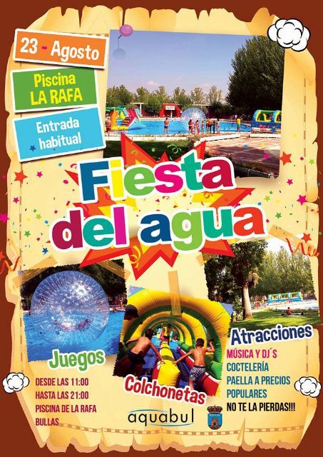 El próximo domingo, 23 de agosto, la piscina de La Rafa celebra la fiesta del agua. Aquabul, la empresa que gestiona la piscina municipal, ha preparado hinchables y actividades, dentro y fuera del agua, para pequeños y mayores. Además, habrá dj, paella a precios populares y sorpresas.