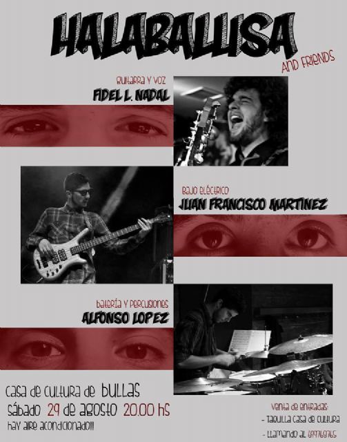Mañana sábado a las 20:00 horas en el auditorio de la Casa de Cultura se presentan ante su público Fidel L. Nadal, a la guitarra y voz, Juan Francisco Martínez, con el bajo eléctrico, y Alfonso López, a la batería y percusiones. Ellos son Halabalusa, un grupo local de pop-rock con un amplio repertorio musical que tocarán temas propios y versiones.