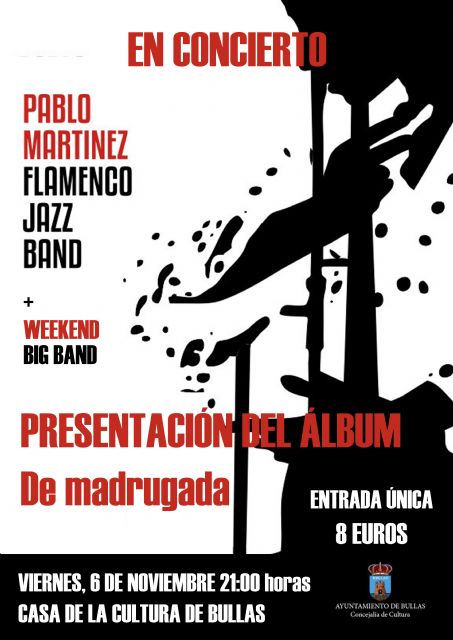 'Pablo Martínez Flamenco-Jazz Band', con la 'Weekend Big Band' de Bullas como invitados, actuarán el viernes día 6 de noviembre en el auditorio de la Casa de Cultura a las 21 horas. Las entradas están ya a la venta en el Informajoven a un precio de 8 euros.