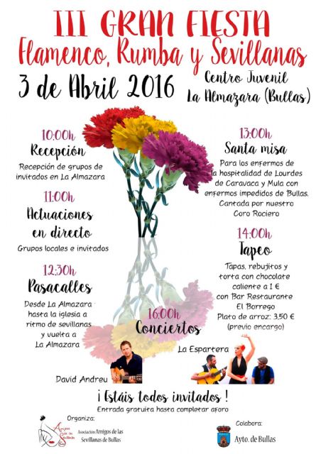 Esta Gran Fiesta la organiza la Asociación de Amigos de las Sevillanas con la colaboración del Ayuntamiento de Bullas. La entrada es gratuita hasta completar aforo.