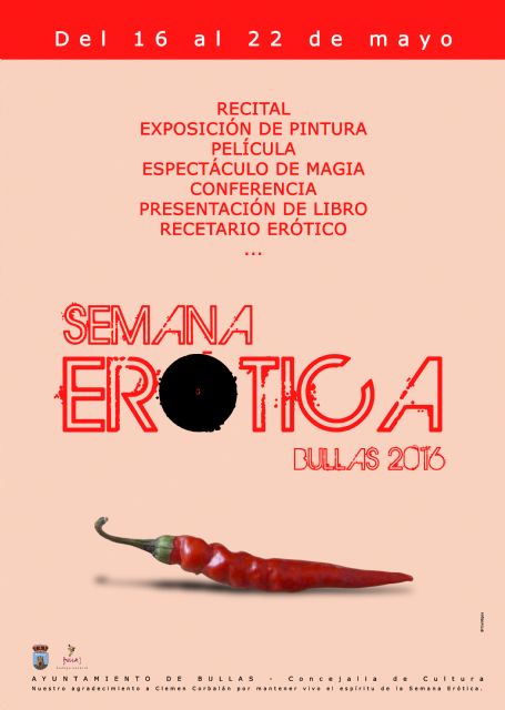Del 16 al 22 de mayo, Bullas celebra su Semana Erótica con distintas actividades culturales amparadas bajo el erotismo más sensual. La Concejalía de Cultura, área que dirige, Antonio José Espín, recupera a la programación el concurso de pintura erótica, que se venía celebrando años atrás en el municipio, junto con el clásico recital de poesía, relatos y canciones. A estas actividades se añaden otras que completan una semana que aúna el arte, el cine, la literatura y el teatro.