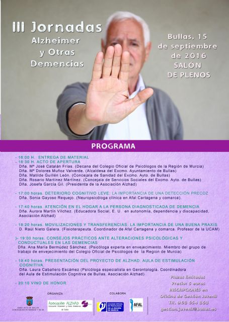 El evento se inaugurará a las 16.30 horas con la presencia de la Decana del Colegio Oficial de Psicólogos de la Región de Murcia, María José Catalán Frías, la Alcaldesa de Bullas, María Dolores Muñoz, la Concejal de Servicios Sociales, Rosario Martínez, la Concejal de Sanidad, Mati Guillén, y la Presidenta de Alzhad, Josefa García.