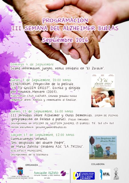 El Día Mundial del Alzheimer se conmemora el próximo 21 de septiembre, por ello la Asociación Alzhad de Bullas, en colaboración con las concejalías de Sanidad y Servicios Sociales, celebra la III Semana del Alzheimer con actividades dirigidas a todos los públicos para sensibilizar y dar a conocer esta enfermedad entre la población.