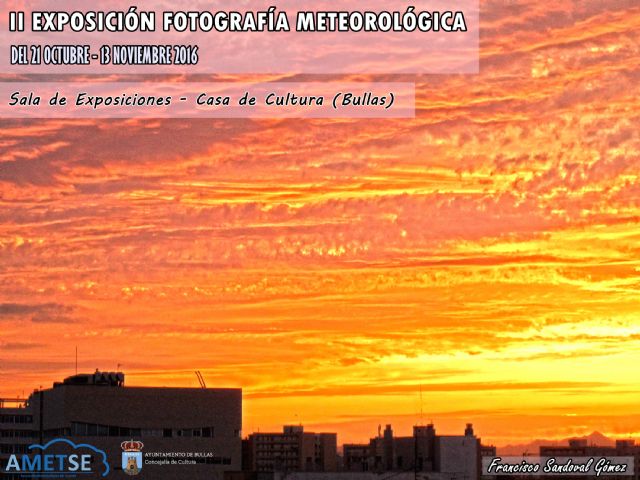 La Sala de Exposiciones de la Casa de Cultura albergará del 21 de octubre al 13 de noviembre la II Exposición 'Fotografía Meteorológica' que organiza la Asociación Meteorológica del Sureste, en colaboración con la Concejalía de Cultura.