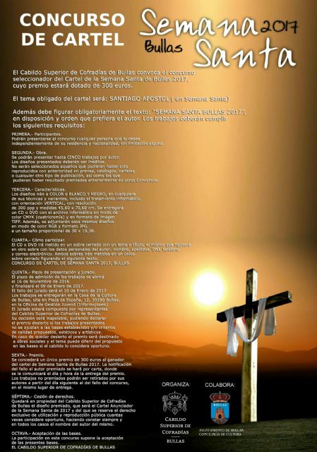 El Cabildo Superior de Cofradías de Bullas, con la colaboración del Ayuntamiento de Bullas, ha convocado un concurso para seleccionar el cartel que anuncie la Semana Santa de Bullas 2017.