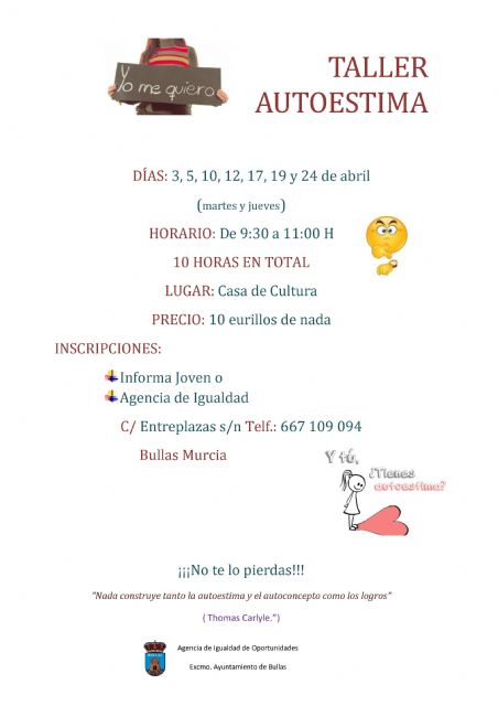 El taller, promovido a través de la Agencia de Igualdad, se impartirá los días 3, 5, 10, 12, 17, 19 y 24 de abril (martes y jueves) en la Casa de la Cultura de Bullas en horario de 9:30 a 11:00 horas de la mañana.