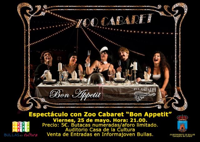 Dentro de la Semana Erótica, mañana viernes a las 21 horas en el auditorio de la Casa de Cultura la compañía teatral Zoo Cabaret visita Bullas para ofrecer su espectáculo burlesque y de humor 'Bon Appetit'.